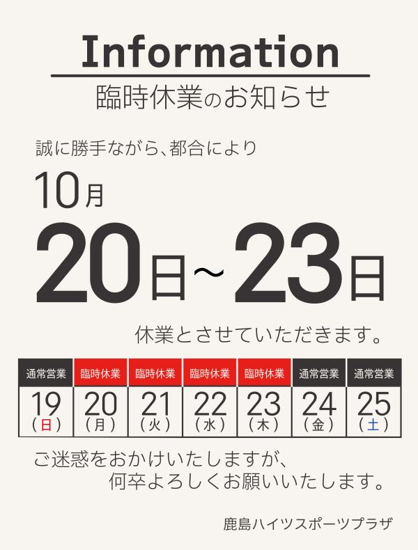 誠に勝手ながら、館内設備点検のため10月20日~23日の間を臨時休業とさせていただきます。