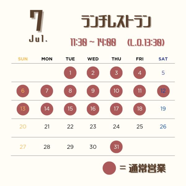 7月のレストラン営業日が決定いたしましたのでお知らせいたします。